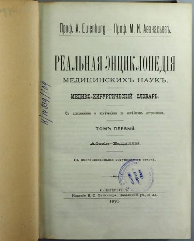 Реальная энциклопедия медицинских наук. Медико-хирургический словарь. Том 1. Абазия – Бациллы. * 1891 год издания. *