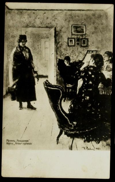 Две дореволюционных художественных открытки * художник Репин . 1. Не ждали . 2. Нежданная.* чистые *