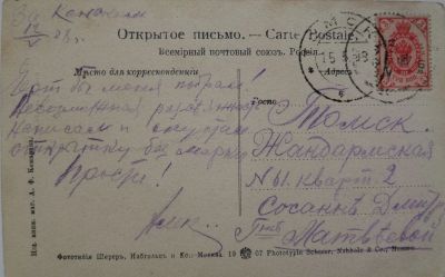 дореволюционная художественная открытка *Очаг. * интересное послание в Ленинград ( наклеено на старое , дореволюционное ).* под наклеенным посланием прослеживаются марка , штемпель и старое письмо.*