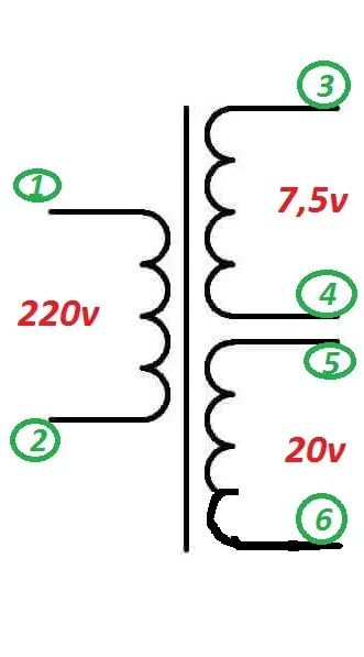 ТП-6-1-2, трансформатор силовой 220 / 7,5v, 20v.