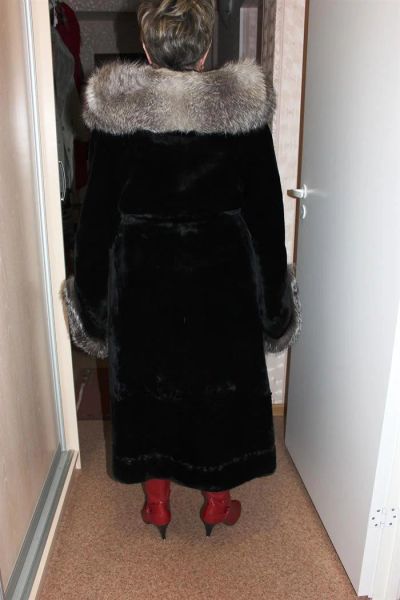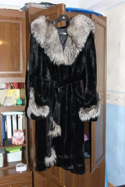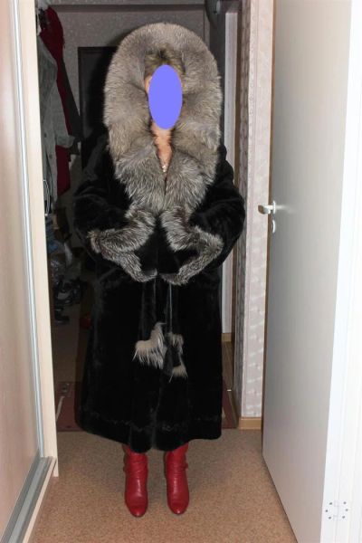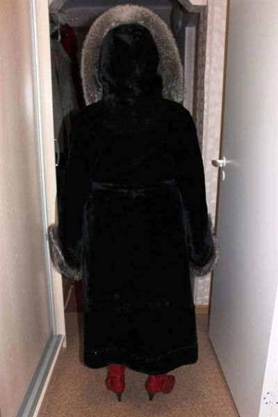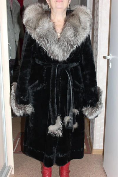 Шуба мутон, черная, длинная. Капюшон чернобурка. 48 размер