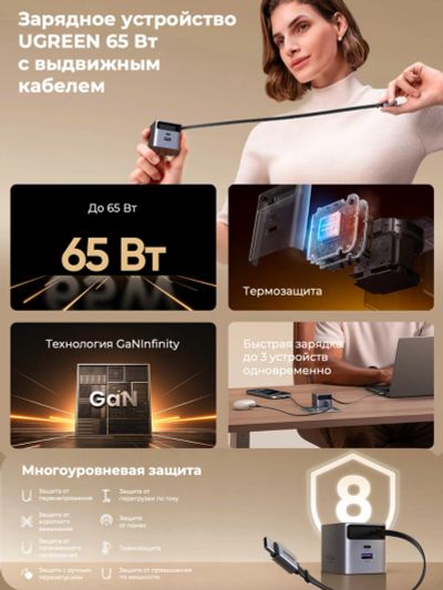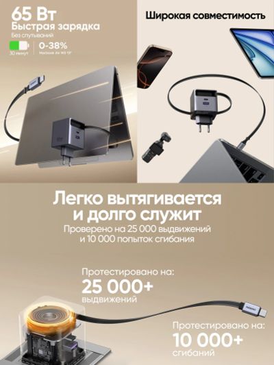 Зардяное устройство UGREEN X615 (65825) 65W GaN Fast Charger USB-C&USB-A with Retractable Cable USB-C, серый космос