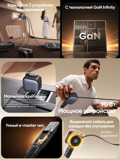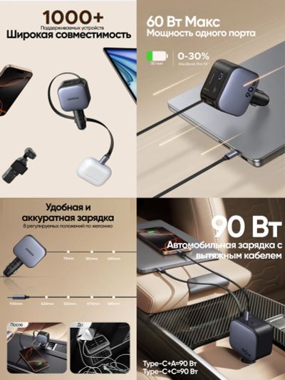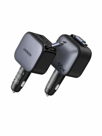 Автозарядка UGREEN EC603 (55909B) 90W Fast Car Charger USB-A&USB-C with Retractable Cable USB-C с выдвижным кабелем, металлик
