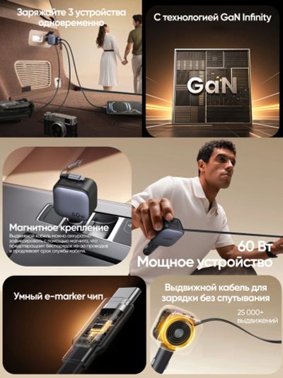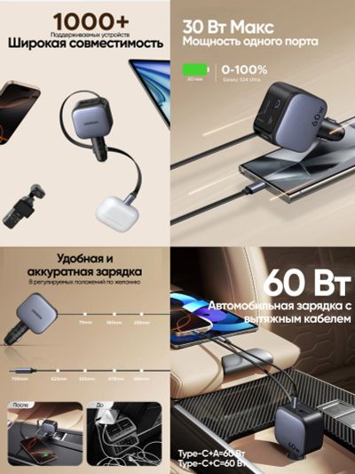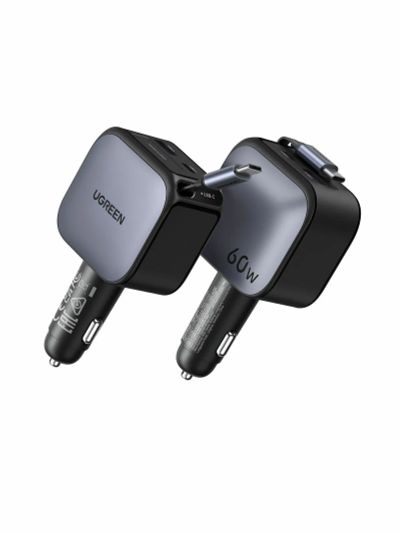 Автозарядка UGREEN EC602 (55212B) 60W Fast Car Charger USB-A&USB-C with Retractable Cable USB-C с выдвижным кабелем, металлик