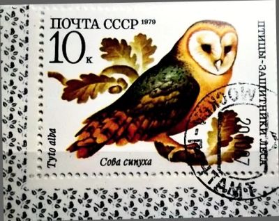 Марки - Фауна. CCCР. Птицы - защитники леса. Сова Сипуха. 1979 год.