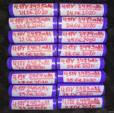 Аккумулятор 18650 16 шт. (цена за шт.) LG LGGBM261865 10A 3.7V Li-ion. Протестированная ёмкость аккумуляторов при токе нагрузки 1 ампер от 2455 до 2497 mAh, каждый подписан. Изоляционные кольца установлены на каждом аккумуляторе