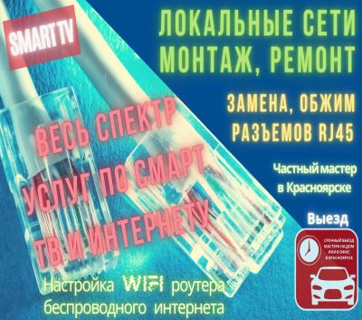 Настройка сети Wi-Fi/роутера/интернет/Smart TV. Обжим/замена коннекторов RJ45 интернет-провода. Укладка/ремонт витой пары (UTP). Ремонт, чистка ноутбука/моноблока/ПК. Windows/Office. Выезд по Красноярску