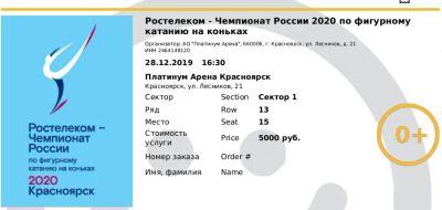 Билеты на Чемпионат России по фигурному катанию (2 билета на 28.12.2019). Парные билеты рядом. Хороший сектор рядом с VIP.
